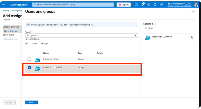 Now select the group you created in step 1.1. And add it to the LiteLLM Enterprise App. At this point we have added Production LLM Evals Group